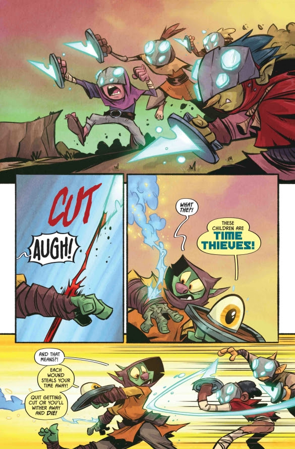 In D’orc #2, D’orc is avoiding every wizard and warrior because some DOOMSDAY prophecy says he will destroy the world. Can he change their minds? Probably not. D’orc, his magic shield, and Ghost-chicken-with-its-head-cutoff are too busy facing a bigger challenge… KIDS!?! They’re time thieves. Oh, and there’s a Time Lord. That guy sucks.