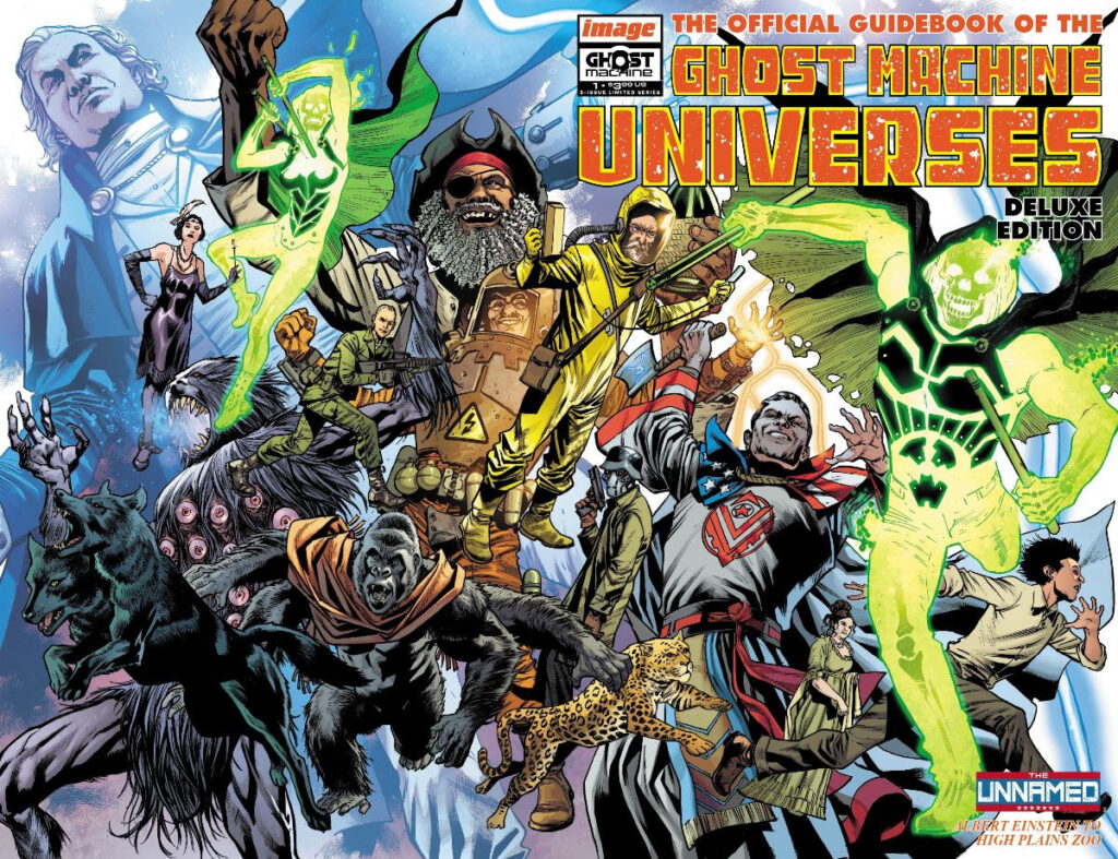 Ghost Machine: The Official Guidebook spotlights more than 120 characters, teasing future storylines and major events across Ghost Machine’s four interconnected universes, including those of THE UNNAMED and the heroes and villains spanning the American timeline found in Geiger, Redcoat, and First Ghost; as well as in: Rook: Exodus and its sweeping science-fiction epic; Hyde Street and its horrific home to the terrifying Residents of a mysterious, nightmarish dimension. And in THE UNBELIEVABLES, where extraordinary figures hide in plain sight, including The Rocketfellers, Hornsby & Halo, the upcoming The Trillion Dollar Kid, and many more soon making their debut.