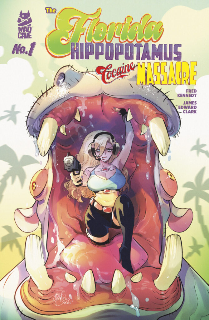 | FEB. 18, 2026 (PORTLAND, OR) — It happened. You were warned. Today, kicking off ComicsPRO in Glendale, California, Mad Cave Studios announced THE FLORIDA HIPPOPOTAMUS COCAINE MASSACRE #1 has sold out at distribution, following its explosive debut! The four-issue absurdist action-comedy comes from writer Fred Kennedy (Dead Romans, Assassin’s Creed: Power), with art, colors, and letters by James Edward Clark (Evil Comics, Tales to Enlighten), an original variant cover B by Italian comics superstar Mirka Andolfo (Sweet Paprika), and the latest printing featuring an all-new cover by Eisner, GLAAD, and Russ Manning-nominated artist, Marguerite Sauvage! “It’s been a ride, dude,” said Fred Kennedy. “James and I have been getting asked to do signings at a bunch of shops, and that was before the second printing was announced! Then we heard from Mad Cave that Marguerite Sauvage would be doing a special cover, and I was floored! That’s not even mentioning all the retailer exclusives. I think a book this silly getting such incredible support is a sign of the times. People need a laugh, they REALLY need a laugh. And hippos always deliver.” From day one, the series leaned fully into slapstick carnage, anti-drug satire, and unapologetic absurdity, and retailers showed up ready for the ride! What started as a love letter to ’80s paranoia, grindhouse energy, and D.A.R.E. assemblies gone feral has quickly become one of Mad Cave Studios’ most talked-about launches of the season. |