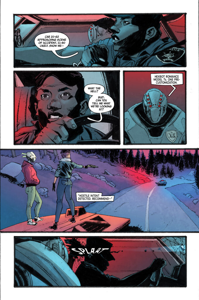 Writer Paul Allor shared, “This is a story I’ve carried in my head for at least a decade, long enough for it to simmer into something more poignant and poisonous than my original conception. We’ve all seen the very real harm of a society that increasingly treats ordinary people as commodities for the ultra-rich and absurdly powerful; a society that measures women, in particular, solely by their usefulness to the men who run everything—So, I took my iridescent rage at that and sharpened it into a five-issue weapon: a story of two sex-bots in love, kissing and groping and killing their way across the countryside.”