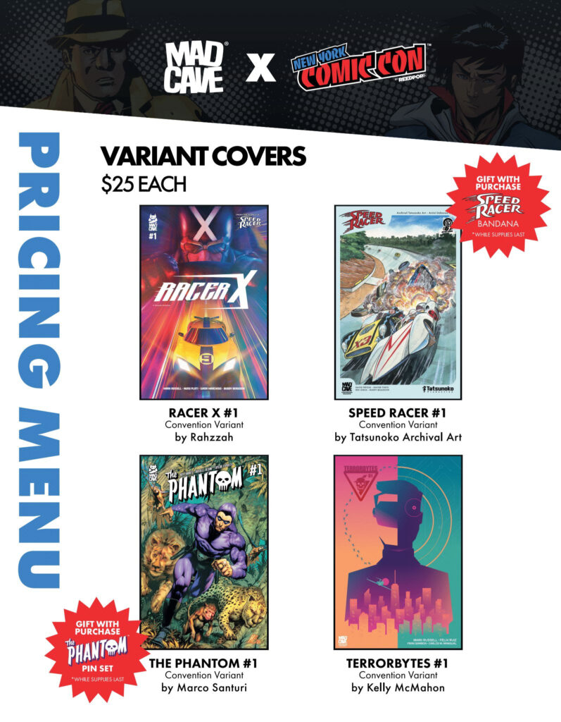 Fans visiting Booth #4455 can grab limited giveaways and convention-only merch all weekend, including debut limited-edition T-shirts featuring Speed Racer and The Phantom, plus exclusive variant covers: Racer X #1 (Rahzzah), Speed Racer #1 (from the Tatsunoko archives), Speed Racer: Tales from the Road#1 (Joe Quesada),The Phantom #1 (Marco Santuri), and Terrorbytes #1 (Kelly McMahon). Receive a Phantom “Mark of the Skull Ring” pin with the purchase of The Phantom convention exclusive, and a Speed Racer bandana with the purchase of the Speed Racer convention exclusive, and free limited Dick Tracy Halloween Special tote bags, while supplies last. Papercutz adds extra treats with a free Miraculous Chibi notebook with any $15 Miraculous Chibi purchase and a free Smurfs bag clip with any Smurfs Archives volume, while supplies last. Throughout the weekend, Mad Cave will also spotlight new, exciting titles and creator signings.