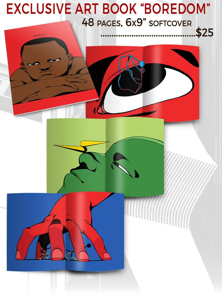 PEACEFUL REMISSIONS and WANDERING are both presented as unique, unwrapped hardcovers, with exposed binding and a color cardstock sleeve encasing each book. This somewhat-raw design juxtaposes a “scavenged” artifact feel with the sleek futuristic elements within each story setting. These 6.5×9” greyscale graphic novels are true works of art, which will also be available in a LIMITED EDITION BOXED SET featuring a sturdy illustrated slipcase, a signed and numbered bookplate, and a limited edition 48-page softcover art book by Nkondo.