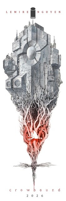 Crowbound reunites Jeff Lemire and Dustin Nguyen for a dark fantasy series launching March 2026. This blood-soaked fairytale explores grief, rage, and parental love as a mother crosses a haunted world to reclaim her child—brutal, emotional, and mythic.