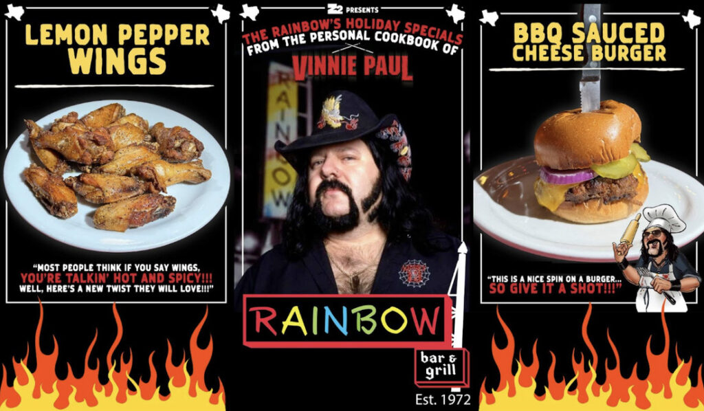 | Los Angeles, CA (Nov 17, 2025)–Available now and throughout this holiday season at the historic Rainbow Bar & Grill, fans of Pantera/Hellyeah/Damageplan legend Vinnie Paul can order three unique dishes straight out of the rocker’s own cookbook. Published posthumously in 2025, the book is an exact version of Vinnie’s recipes that he had cooked for friends and family for many years before his passing. Now, his epic BBQ Sauced Cheese Burger, Texas Style Cheese Steak Sammich and Lemon Pepper Wings are yours to feast on, thanks to the Rainbow—One of Vinnie’s all-time favorite spots—and cookbook publisher, Z2. |